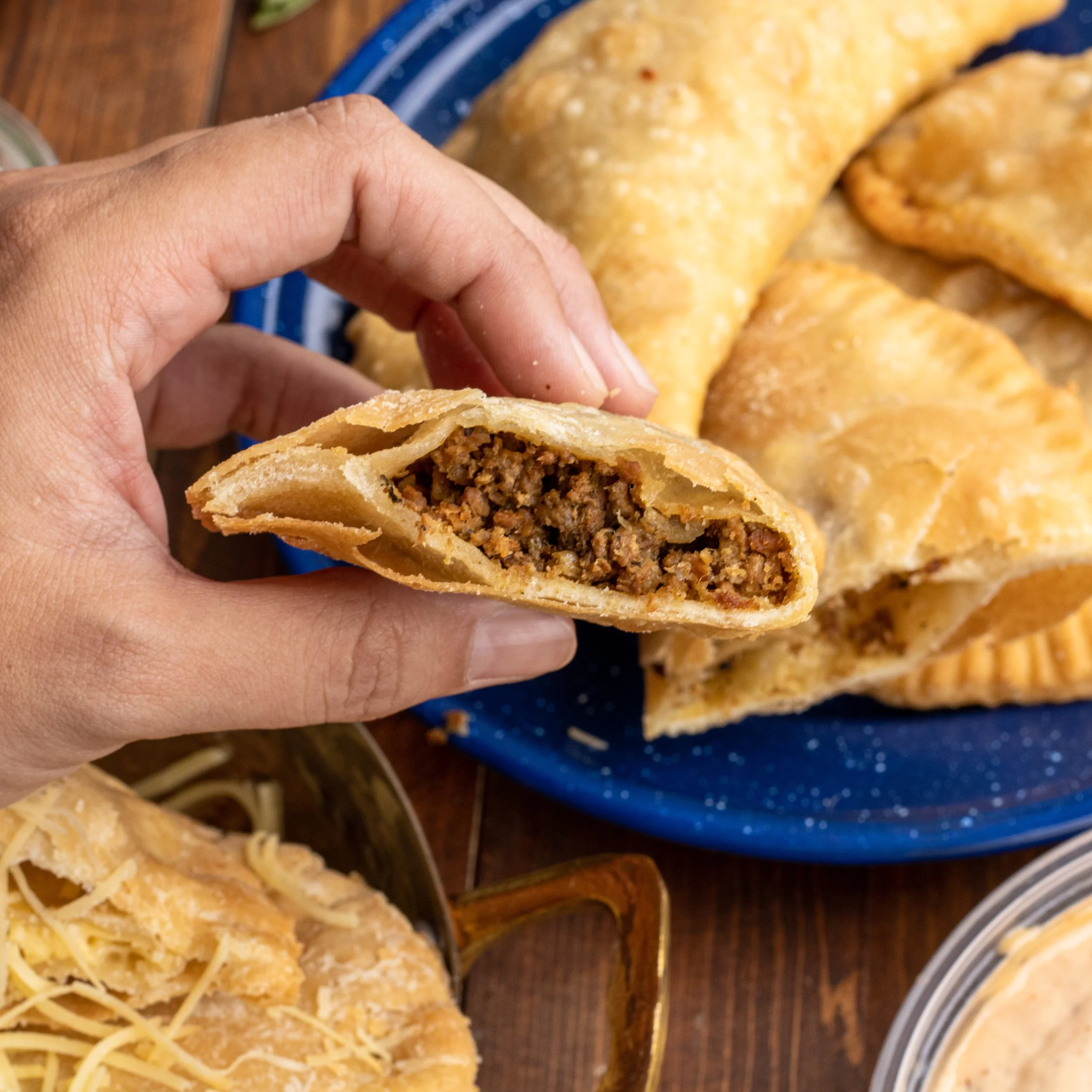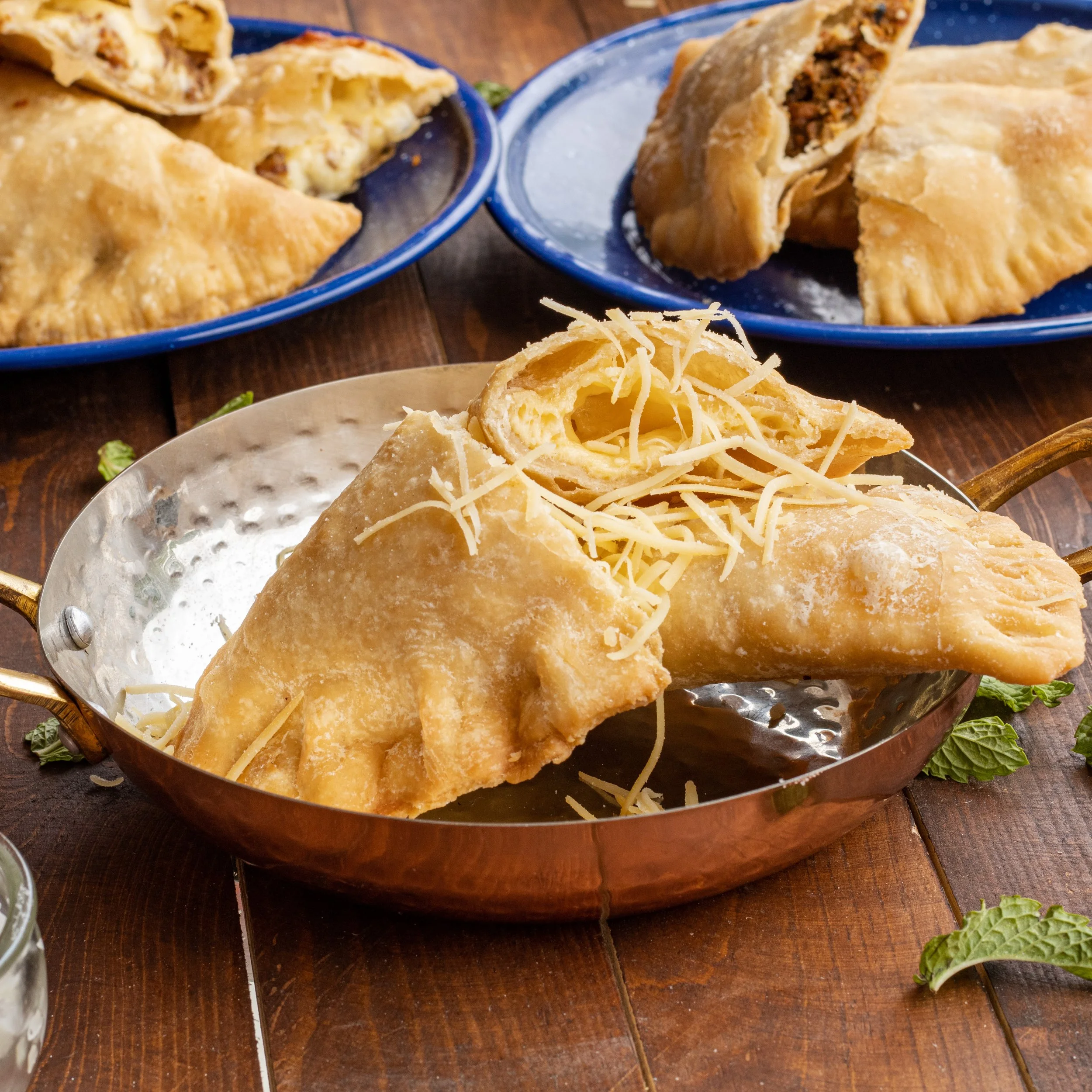Empanada hecha a base de masa de harina, rellena de carne molida con queso gouda. ¡La Favorita!