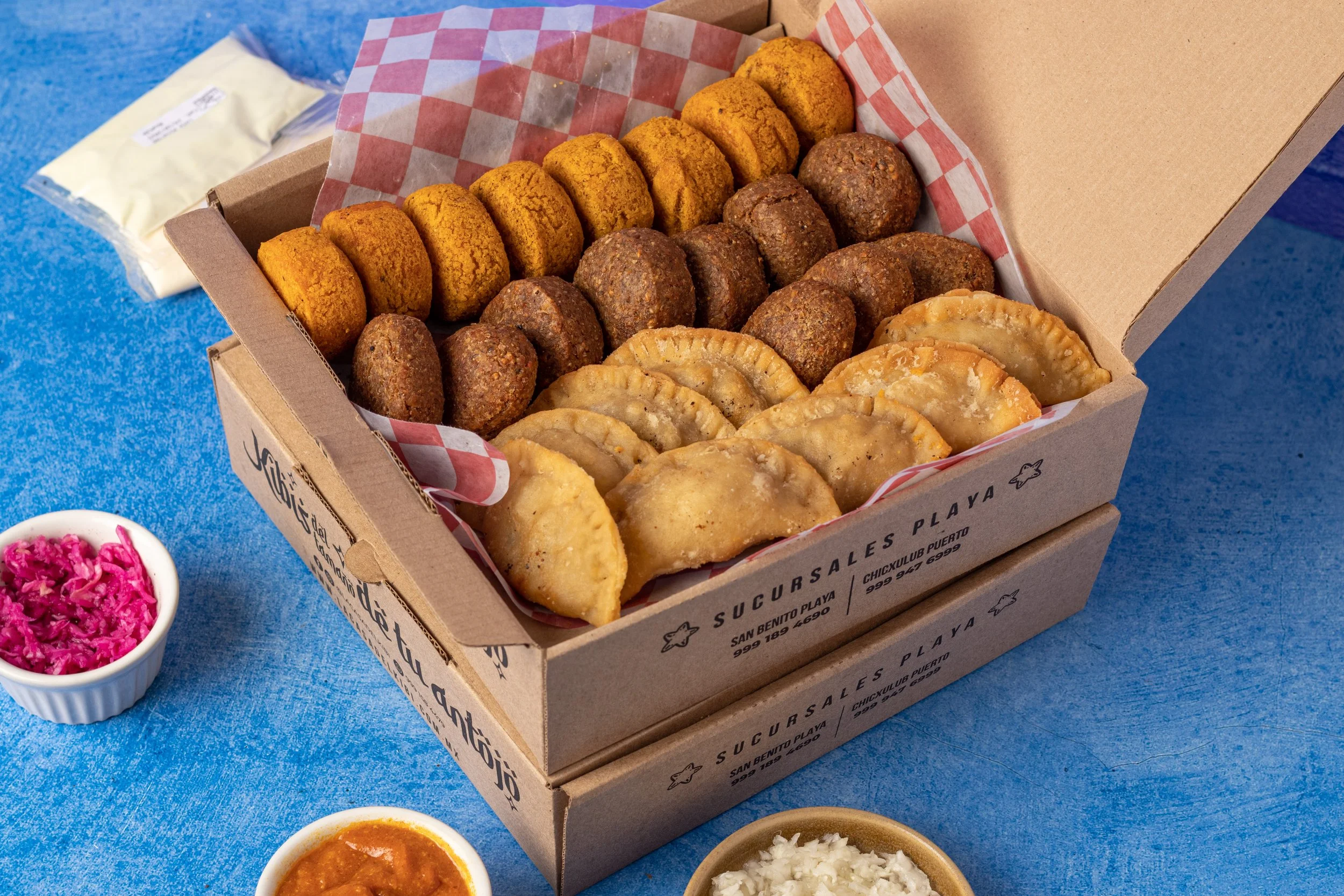 8 kibis rellenos medianos (carne molida, queso de bola, champiqueso), 8 empanadas medianas, 8 pibes medianos