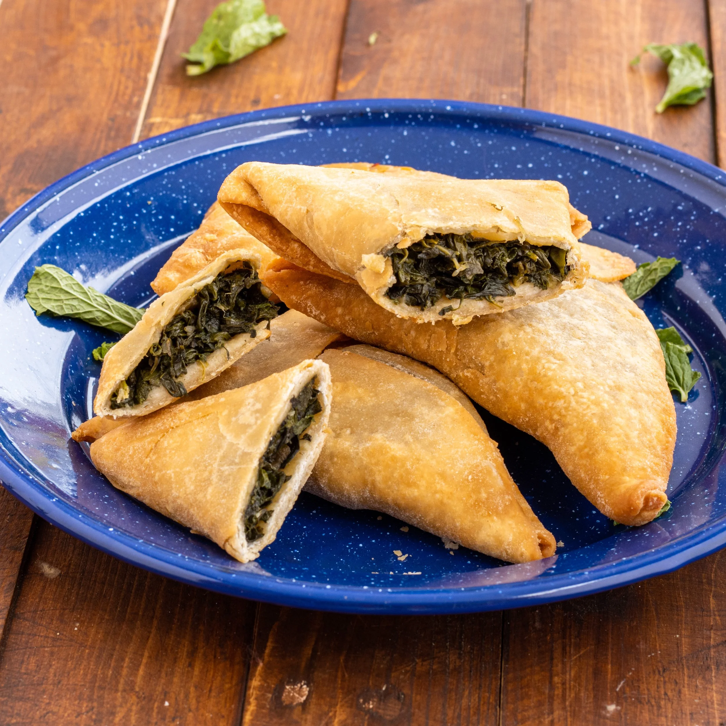 Empanada hecha a base de masa de harina estilo árabe, rellena de acelga, cebolla y especias. Libre de carne. ¡Exquisita!